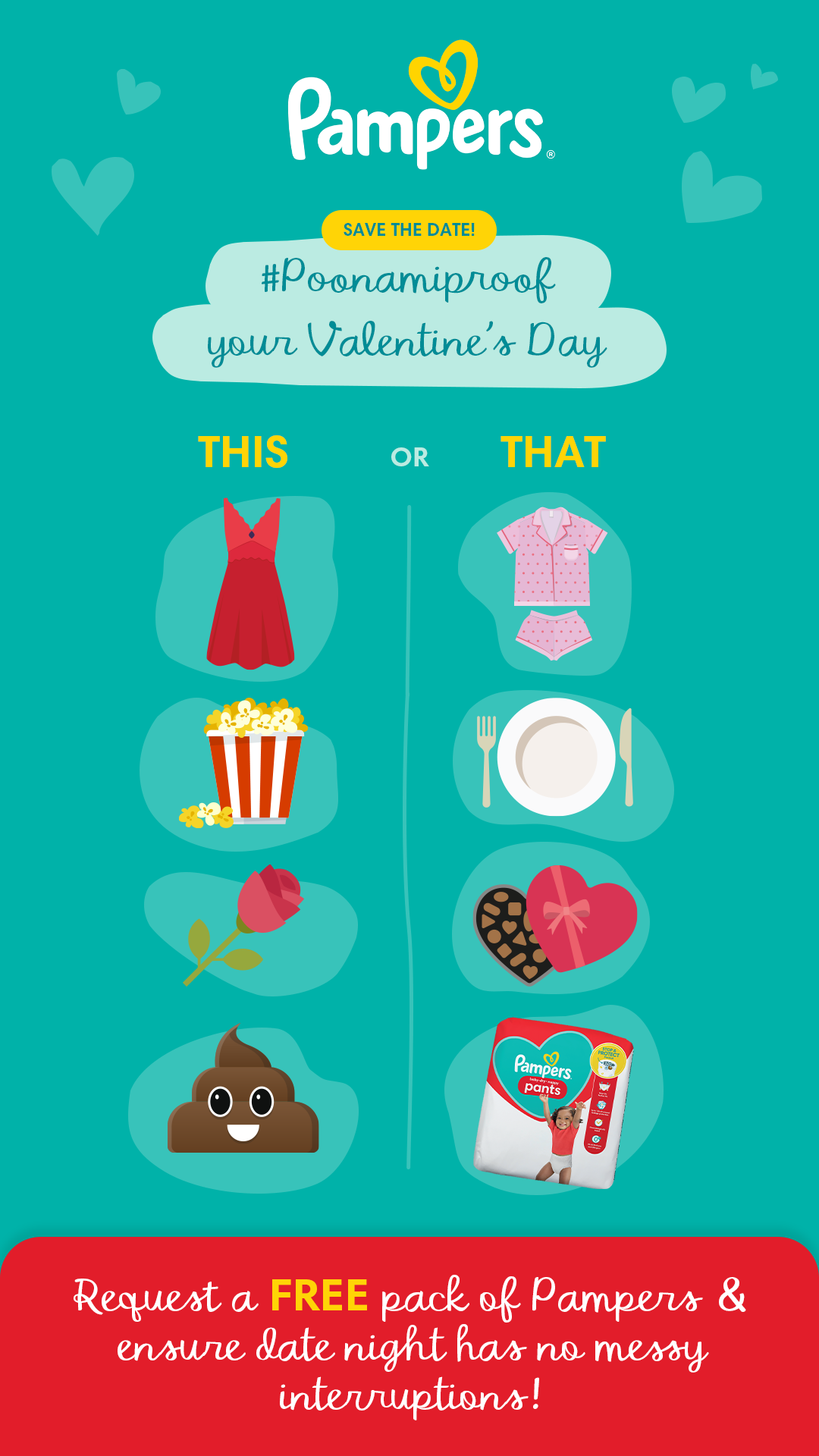 Let your pals know that this Valentine’s Day is the day to rekindle the passion with their partner because they too can claim a FREE pack of Pampers Baby-Dry Nappy Pants to ensure there are no messy interruptions.