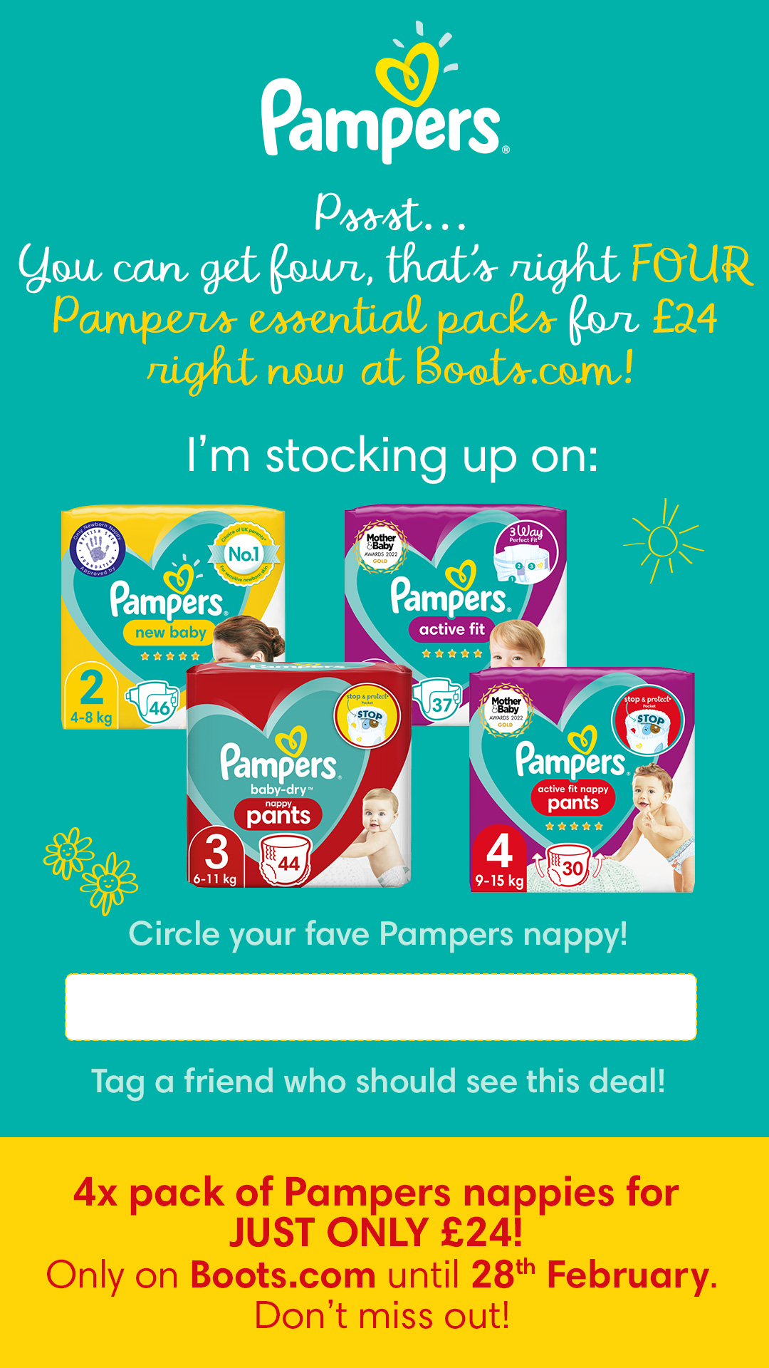 - Get 4x Pampers Essential Packs for £24 (Includes: New Baby Nappies, Active Fit Nappies, Active Fit Nappy Pants and Baby Dry Nappy Pants)