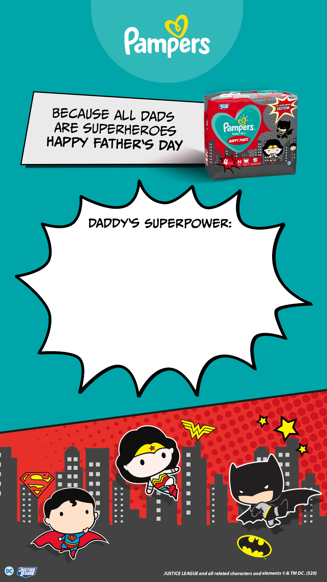 - Then, download the superhero template and publish to your story to let your pals know about the superpower of your real-life superhero - and the super cute Pampers Superhero Nappy Pants, of course!